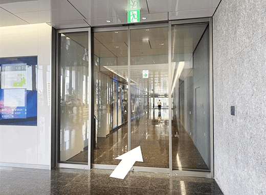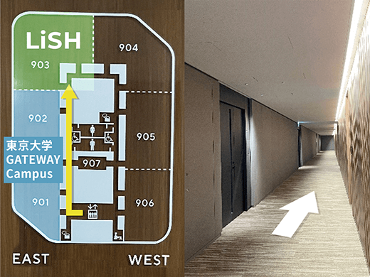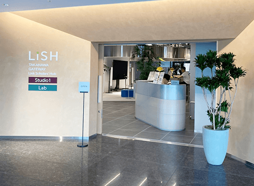 3EVホールを出て右側の自動ドアを進むと正面にLiSHの看板が -