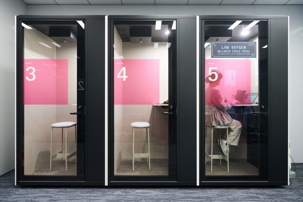 LiSH内の会議室に、標高約1,000〜1,500m相当の体に負担の少ない常圧低酸素空間(通称「ロンジェビティルーム」)を設置しています。この空間で日常と同じデスクワークを行い、どのような健康効果が得られるかを検証します。